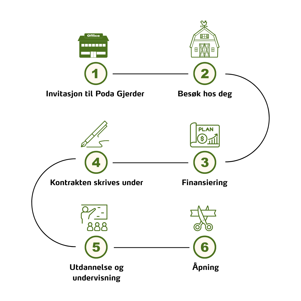 Nå vil vi gjerne besøke deg der du bor så vi kan få innblikk i dagligdagen din og omgivelsene dine. I løpet av dette møtet drøfter vi franchisekontrakten og Poda Gjerders håndbok med deg. Likedan snakker vi også om bedriftsbygninger, investeringer og finansiering såfremt dette er nødvendig.